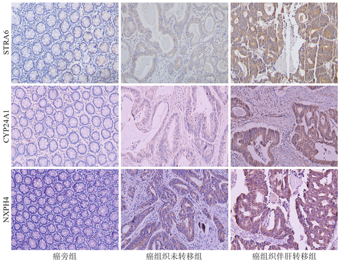 This study aimed to investigate the expression of stimulated by retinoic acid 6(STRA6), cytochrome P450 family 24 subfamily A member 1(CYP24A1), and neurexophilin 4(NXPH4) proteins in colorectal cancer liver metastasis and their correlations with clinicopathological characteristics, prognosis, and diagnostic significance.