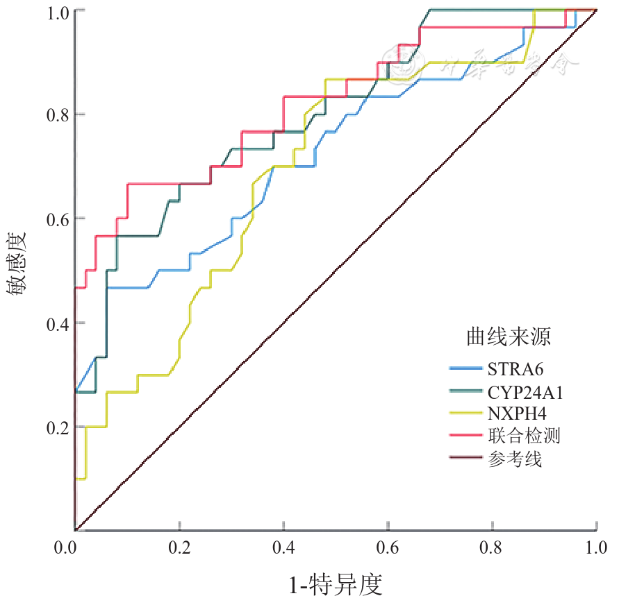 The expression levels of STRA6, CYP24A1, and NXPH4 were significantly higher in the liver metastasis group compared to the non-metastasis and paracancerous tissue groups (P<0.05). In colorectal liver metastasis patients, high expression of STRA6 and NXPH4 was correlated with lymph node metastasis and depth of invasion, while high expression of CYP24A1 was associated with lymph node metastasis, depth of invasion, and tumor differentiation (P<0.05). Survival analysis showed that colorectal liver metastasis patients with high expression of STRA6, CYP24A1, and NXPH4 had a lower 5-year survival rate (HR=2.690, 4.279, and 2.784, respectively; P<0.05). Liver metastasis in colorectal cancer patients was correlated with lymph node metastasis, depth of invasion, and degree of differentiation, and CEA (P<0.05). Multivariate analysis identified lymph node metastasis, CEA≥5 ng/mL, and elevated levels of STRA6, CYP24A1, and NXPH4 as independent risk factors for liver metastasis (P<0.05). ROC curve analysis demonstrated that the AUC values for predicting colorectal liver metastasis were 0.722 (95%CI: 0.602~0.843) for STRA6, 0.797 (95%CI: 0.696~0.898) for CYP24A1, and 0.696 (95%CI: 0.577~0.814) for NXPH4. The sensitivities and specificities were 46.70% and 94.00% for STRA6, 56.70% and 92.00% for CYP24A1, and 86.70% and 52.00% for NXPH4, respectively. The combined detection of these proteins achieved an AUC of 0.820 (95%CI: 0.719~0.921), with a sensitivity of 66.70% and specificity of 90.00%.